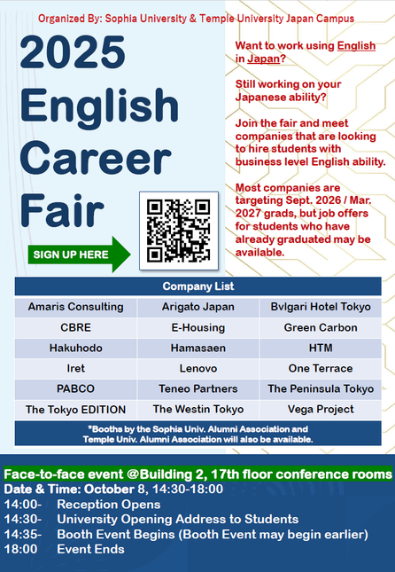 Sophia University and Temple University, Japan Campus (TUJ) will hold a joint career fair. This event will be held entirely in English. Most companies will be hiring students graduating in 2026 or later, but all Sophia students and recent alumni are welcome to attend!