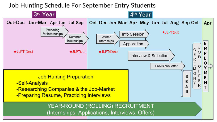 For students enrolling or graduating in September, it can be difficult to visualize the timing of job hunting in Japan. Please refer to the diagram below to get a sense of the overall schedule.