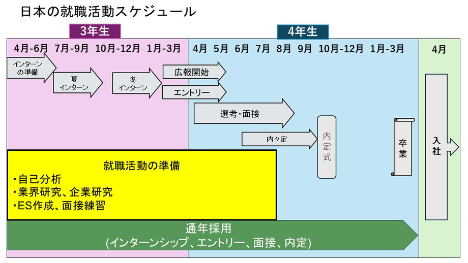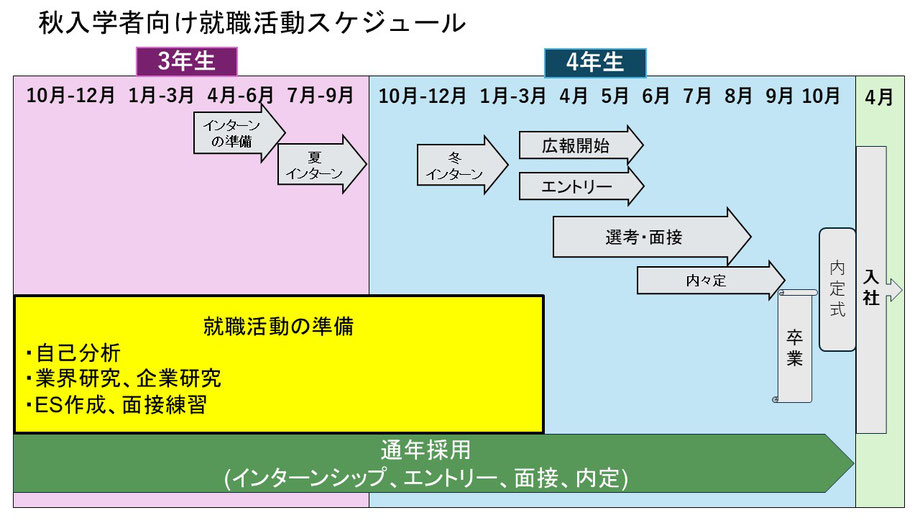 9月入学・卒業者は、日本での就職活動の時期がイメージしづらいため、以下の図をもとに、スケジュール感を掴んでください。